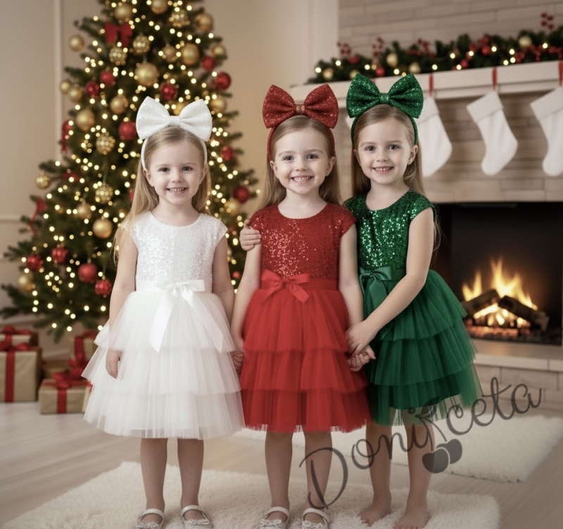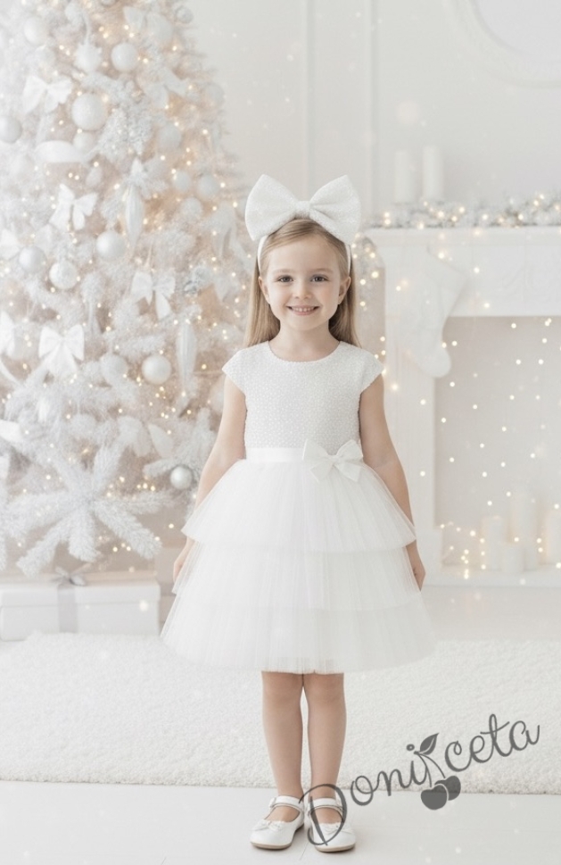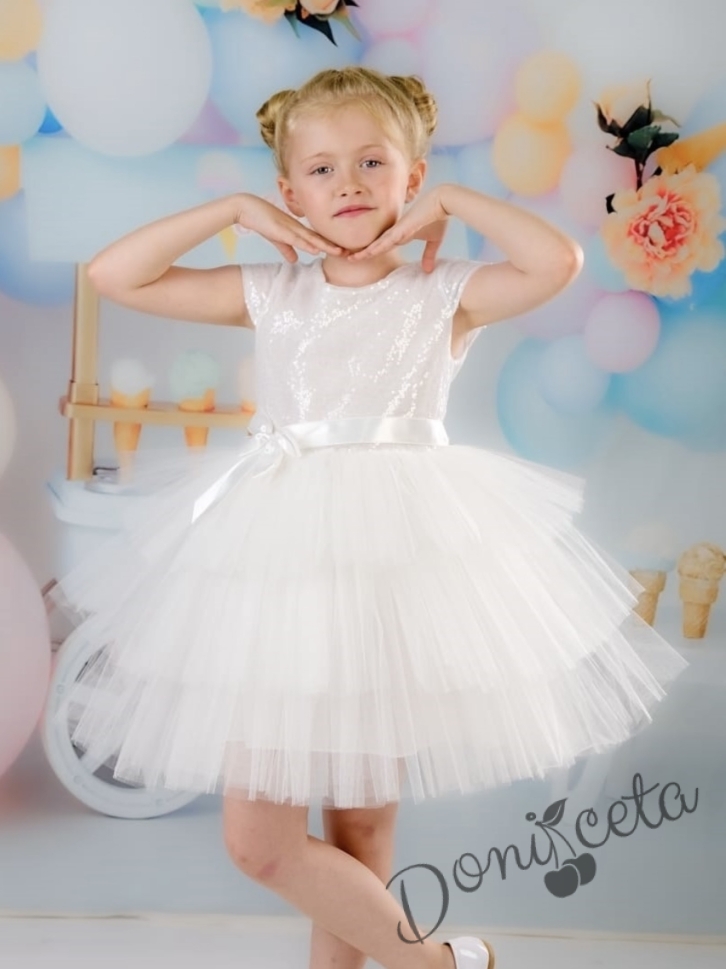 Детска празнична рокля Хава в бяло от пайети и тюл на пластове от колекция Снежина