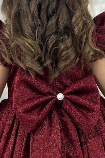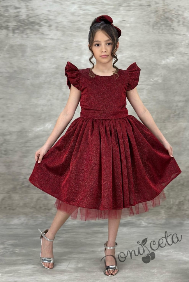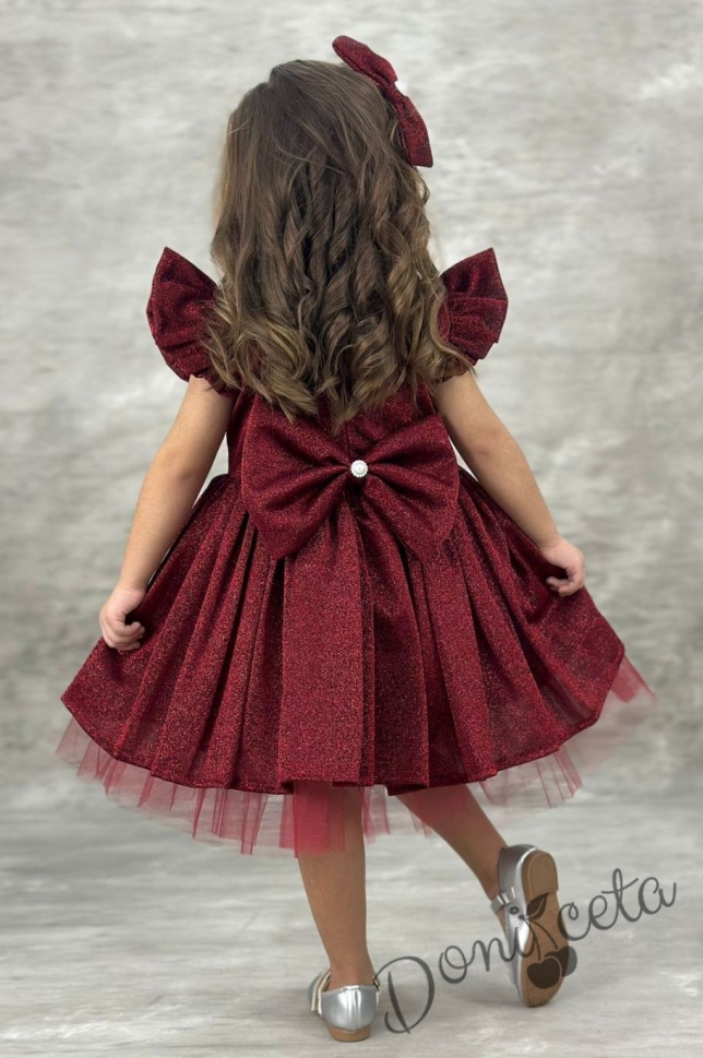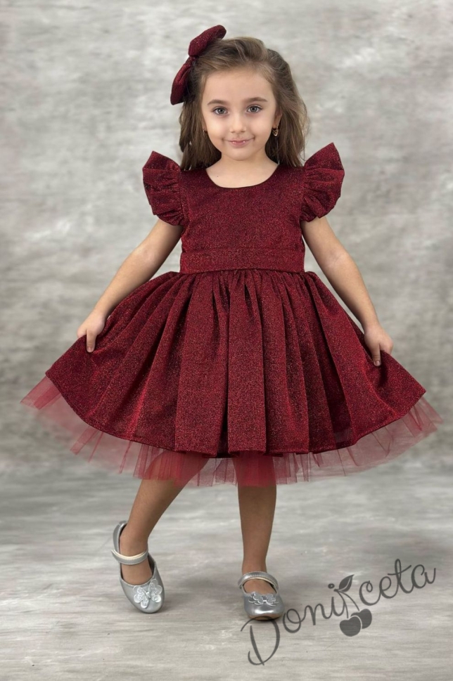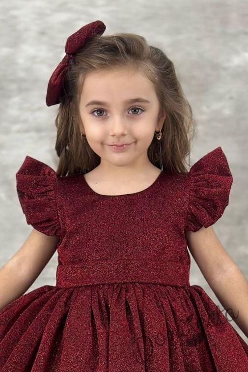 Празнична детска рокля с къс ръкав с брокат Балеа в бордо с фиба за коса от колекция Бордолина