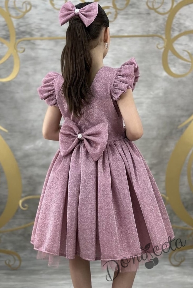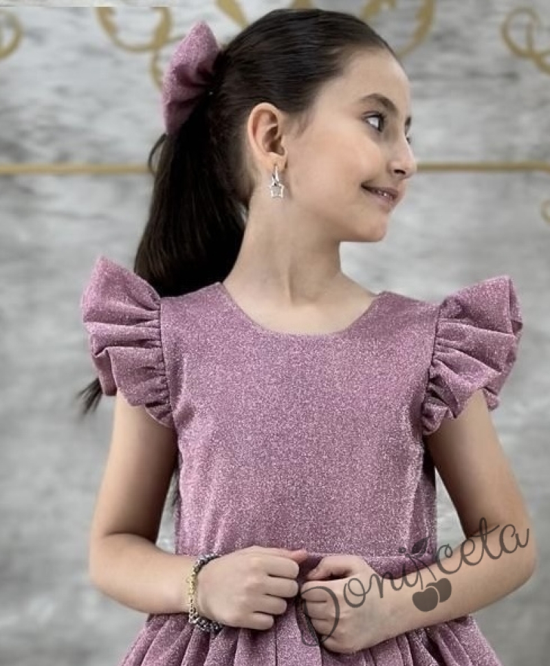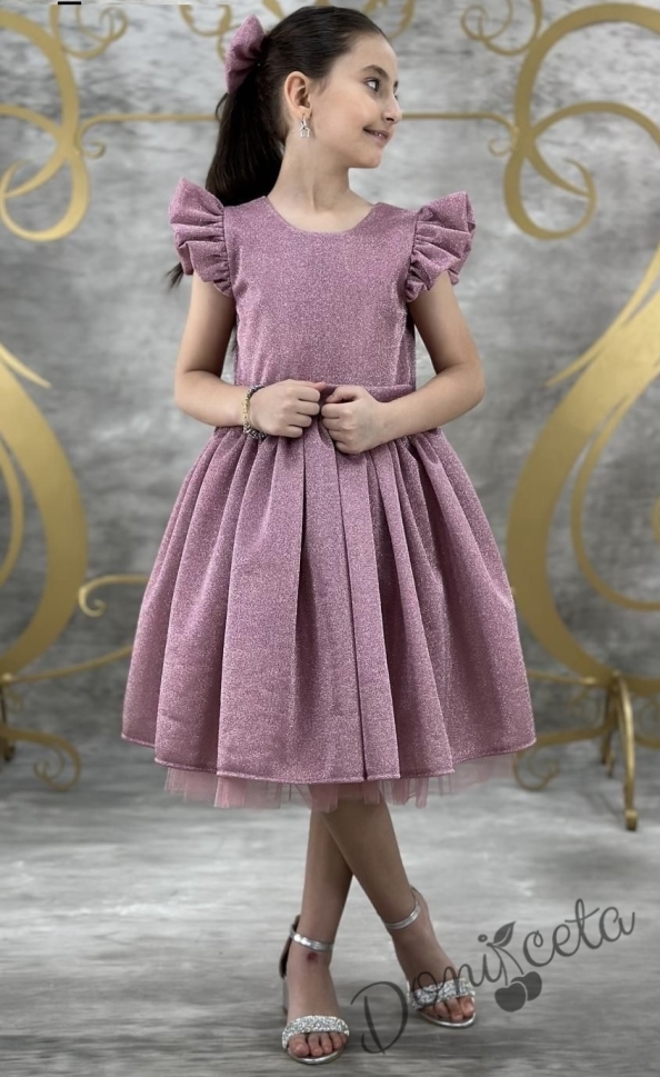 Впечатляваща детска рокля, създадена за специални поводи! Изработена от висококачествена блестяща материя в елегантен цвят пепел от рози, тя придава изискан и празничен вид. Горната част е с красиво оформени къси ръкавки тип "крилца", а полата е богато разкроена с тюл отдолу за допълнителен обем и приказен ефект.