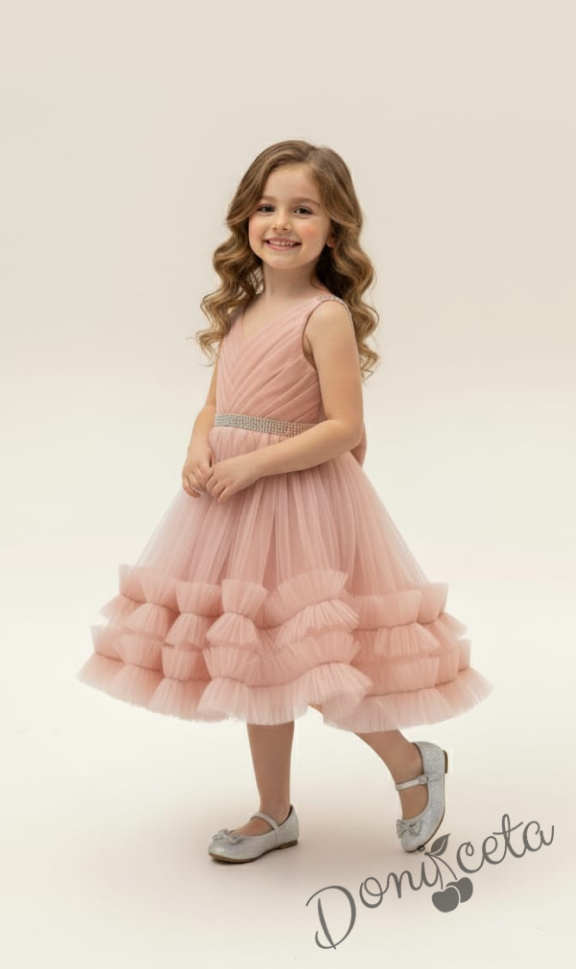 Официална детска/бебешка рокля в прасковено с тюл и панделка Тиана
