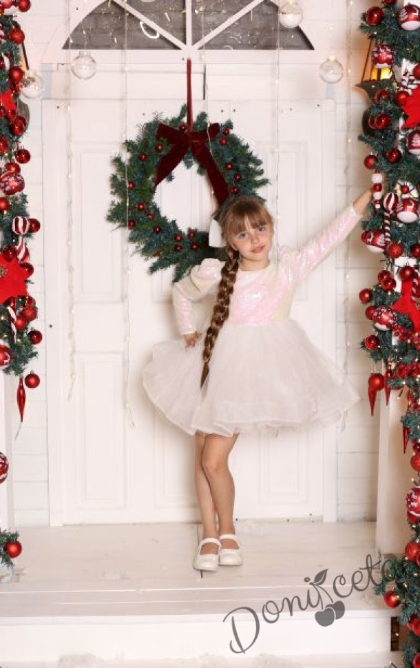 Детска официална рокля Кара в бяло от пайети и тюл на пластове с панделка за коса