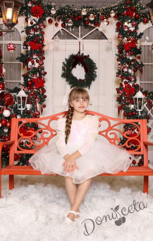 Официална детска рокля с тюл и помпони в бяло с пайети Блян и панделка за коса