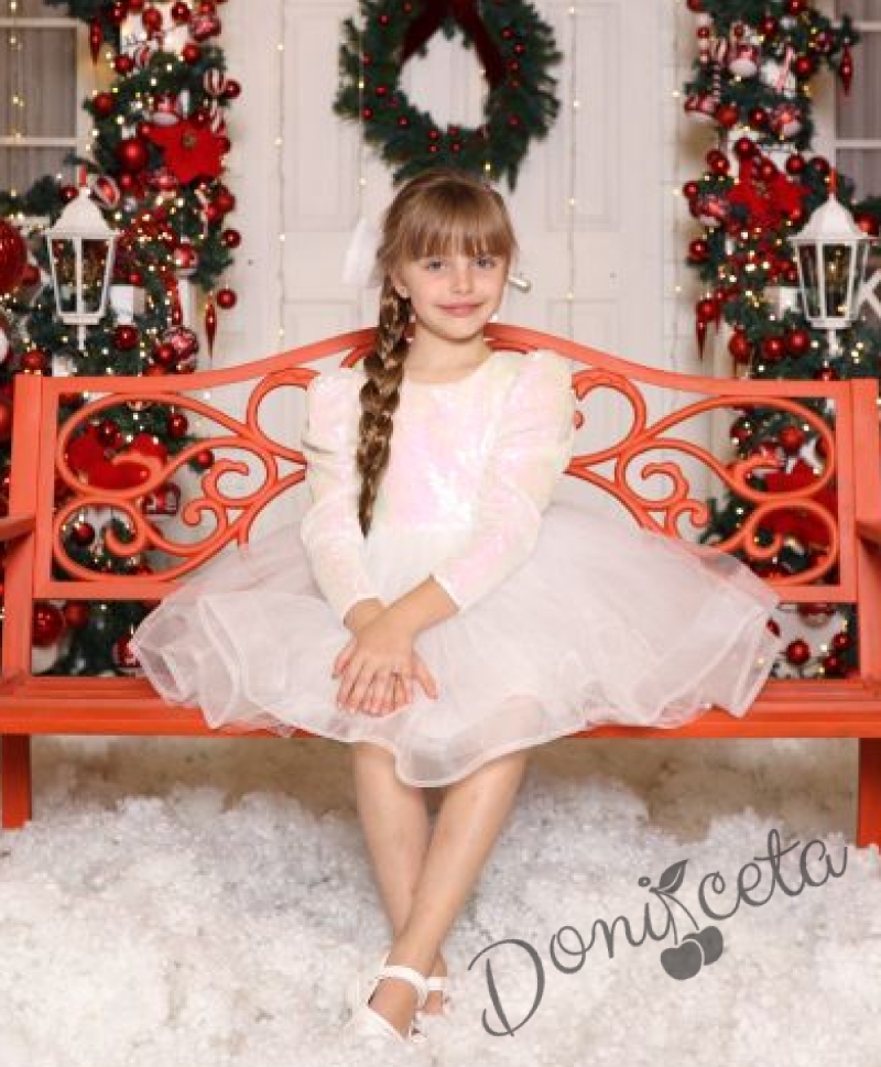 Официална детска рокля в бяло с тюл и пайети Фазилет и панделка за коса