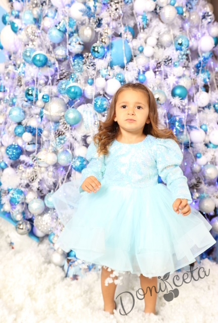 Официална детска празнична рокля с дълъг ръкав в светлосиньо с пайети Людмила от колекция Светлосияна