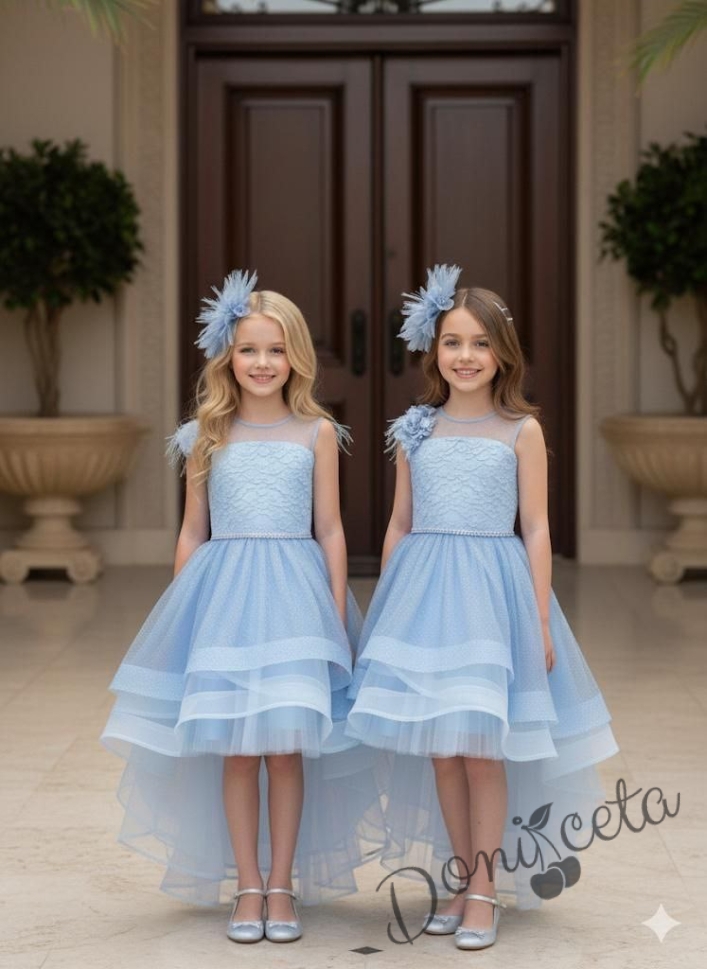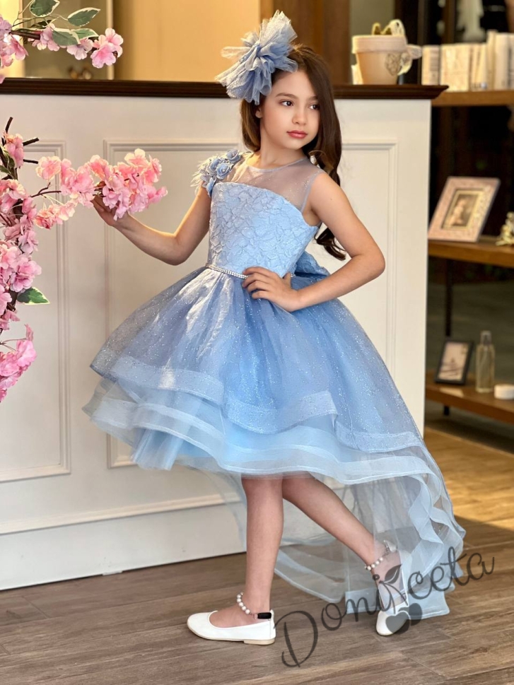Официална детска рокля в светлосиньо с шлейф Шантал с аксесоар за коса от колекция Светлосияна