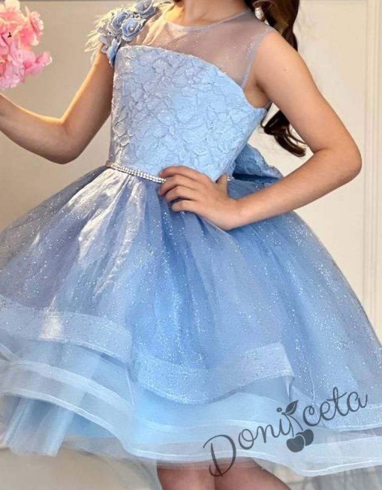 Позволете на вашата малка принцеса да заблести с тази официална детска рокля в светлосиньо, изработена с нежна дантела и красив шлейф. Тази рокля е създадена, за да превърне всяко момиченце в истинска принцеса!