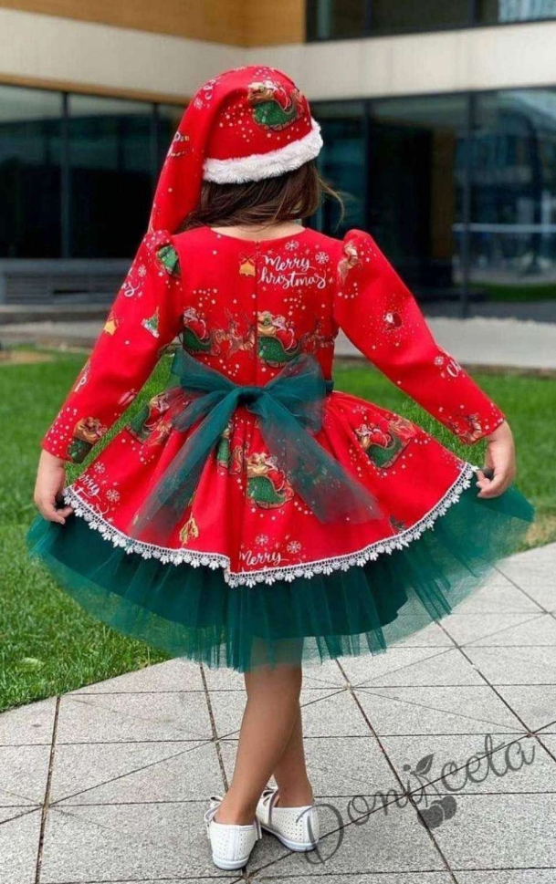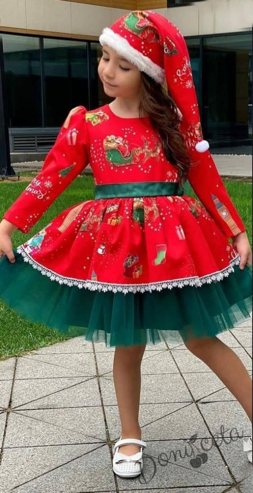 Коледна детска рокля с дълъг ръкав в червено с коледни мотиви и панделка, тюл в зелено и коледна шапка