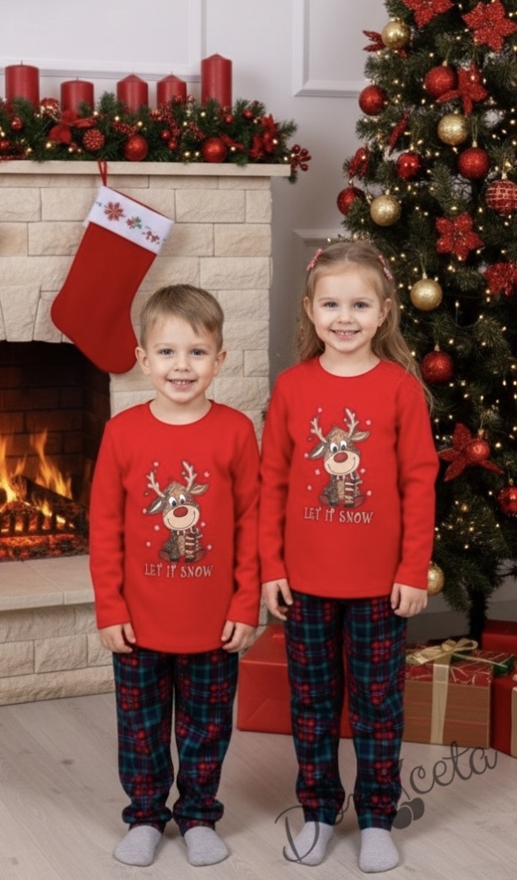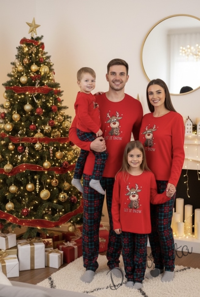 Детска, дамска или мъжка коледна пижама в червено с весело еленче и надпис