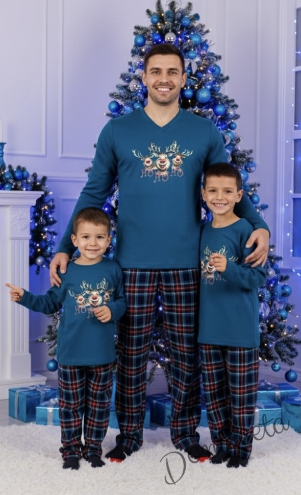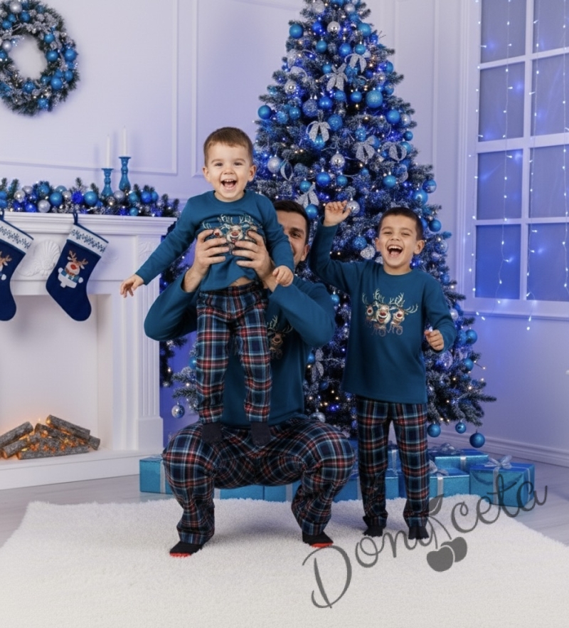 - Прекрасна памучна коледна пижамка в синьо с еленчета и надпис.