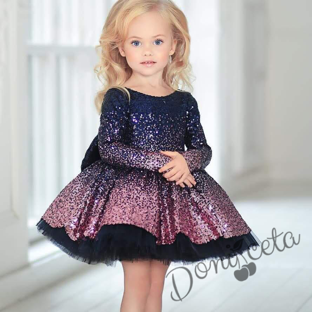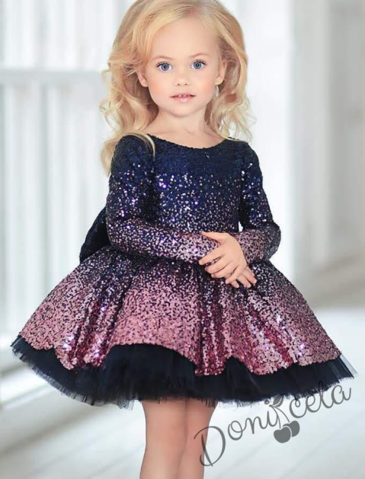 • Оригинална детска рокля с дълъг ръкав в преливащ цвят в пепел от рози и много пластове богат тюл под полата..