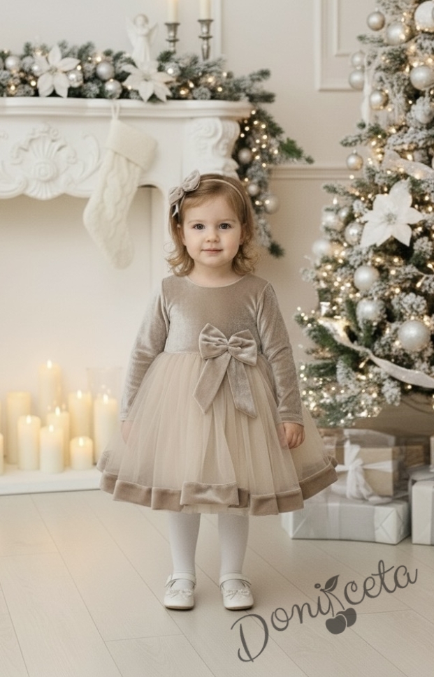 Детска рокля в бежово с тюл и панделка Тая и фиба за коса от колекция Бежина