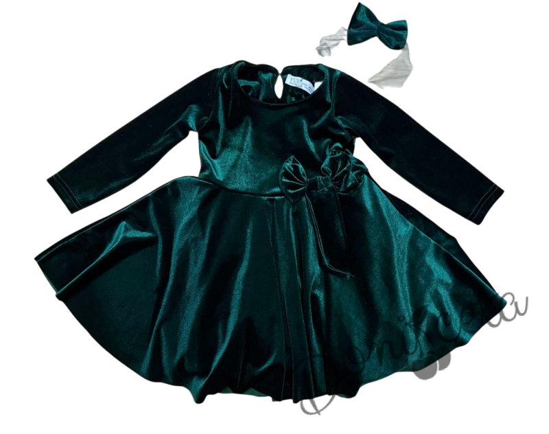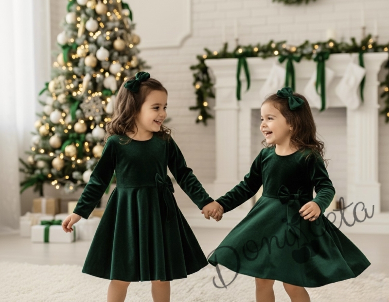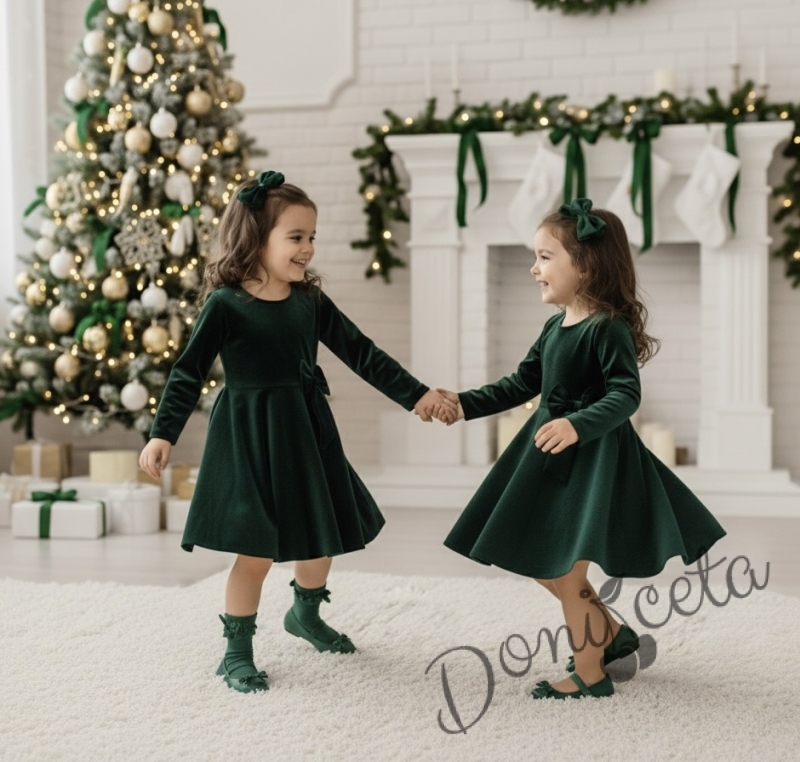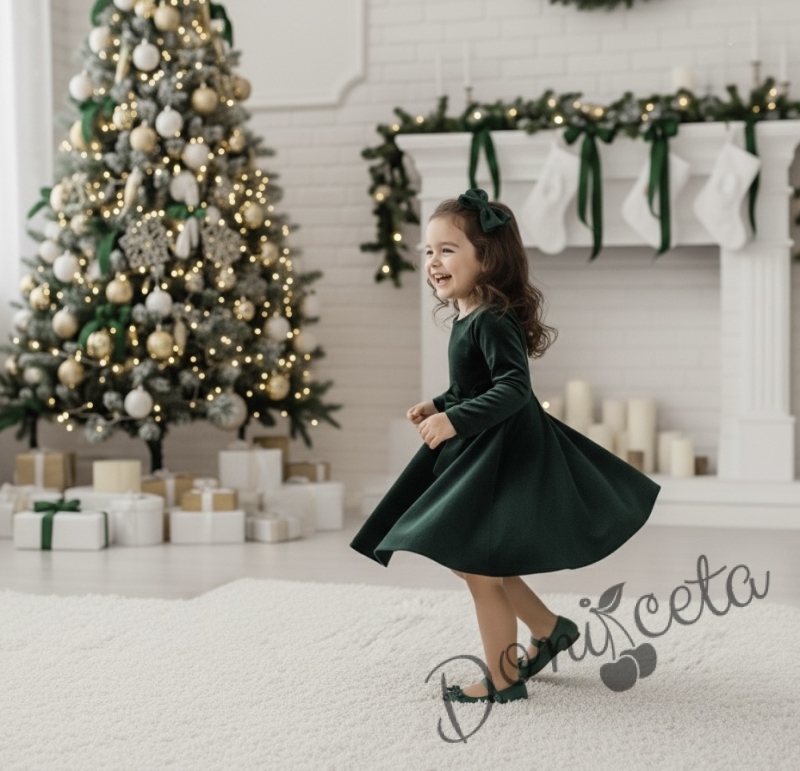 Детска коледна рокля плюш в зелено с панделка Елиса и фиба за коса