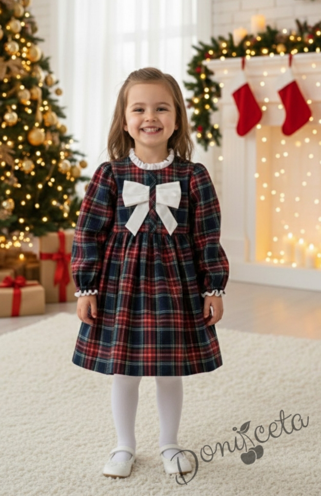 Детска коледна рокля с дълъг ръкав в каре с панделка Карена