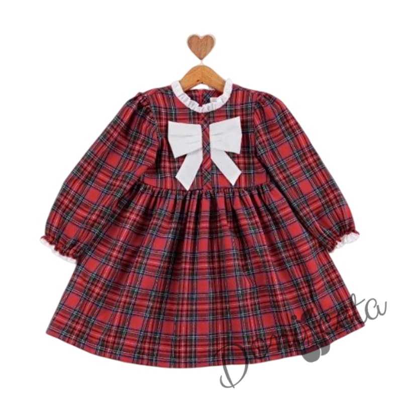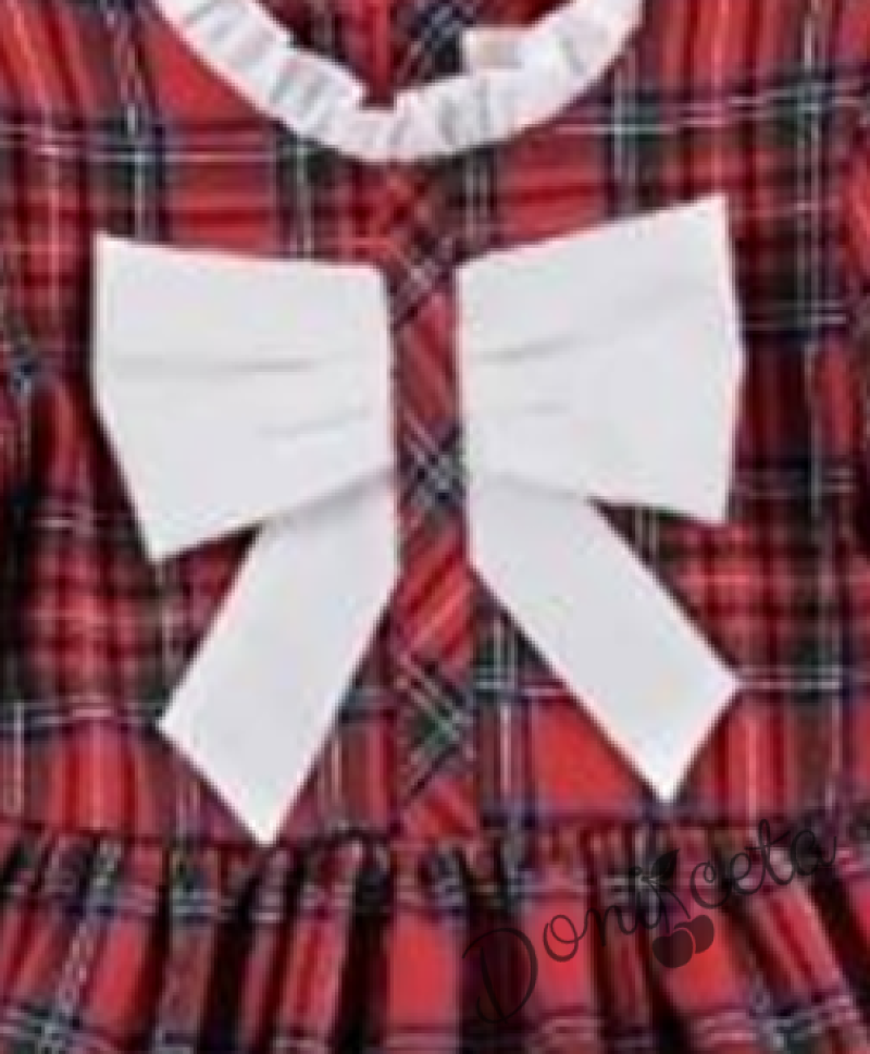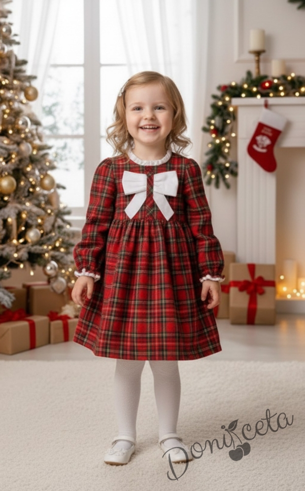Детска коледна рокля с дълъг ръкав в червено каре с панделка