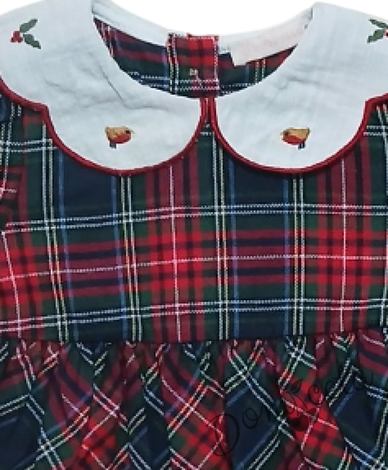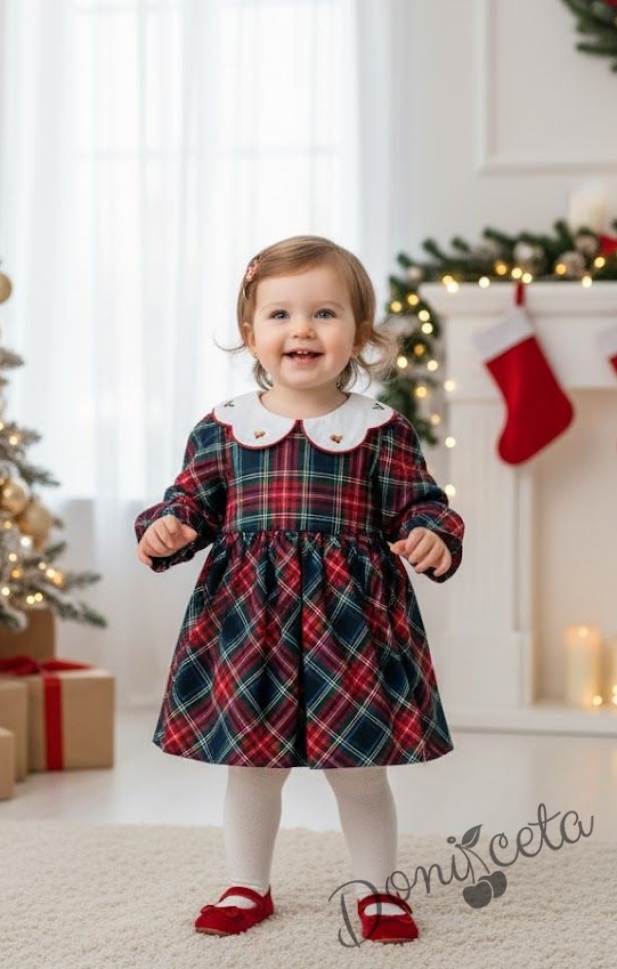 Бебешка коледна рокля с дълъг ръкав в каре с ефектна яка с коледни мотиви