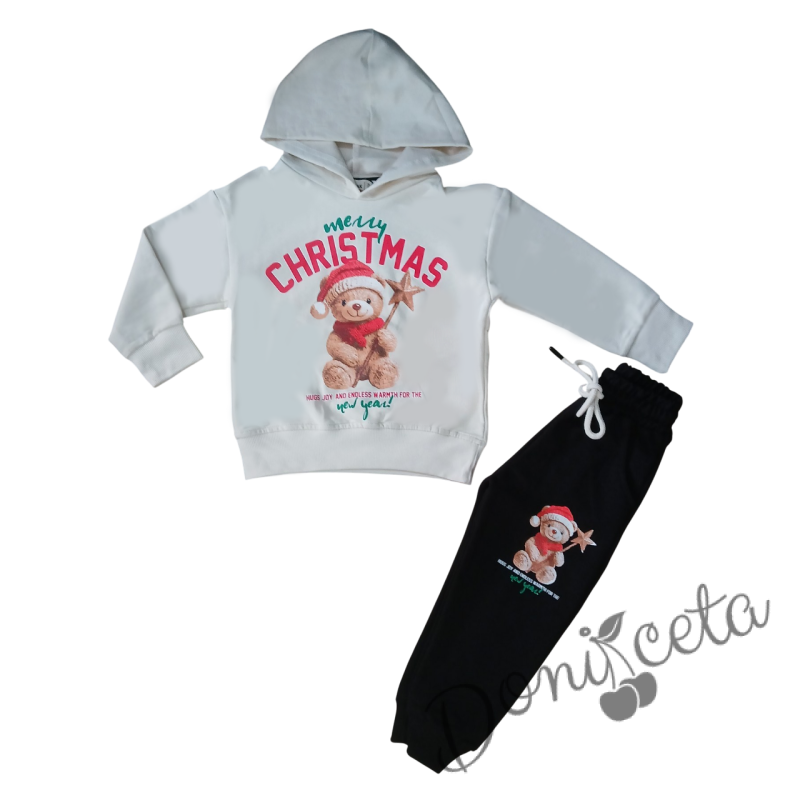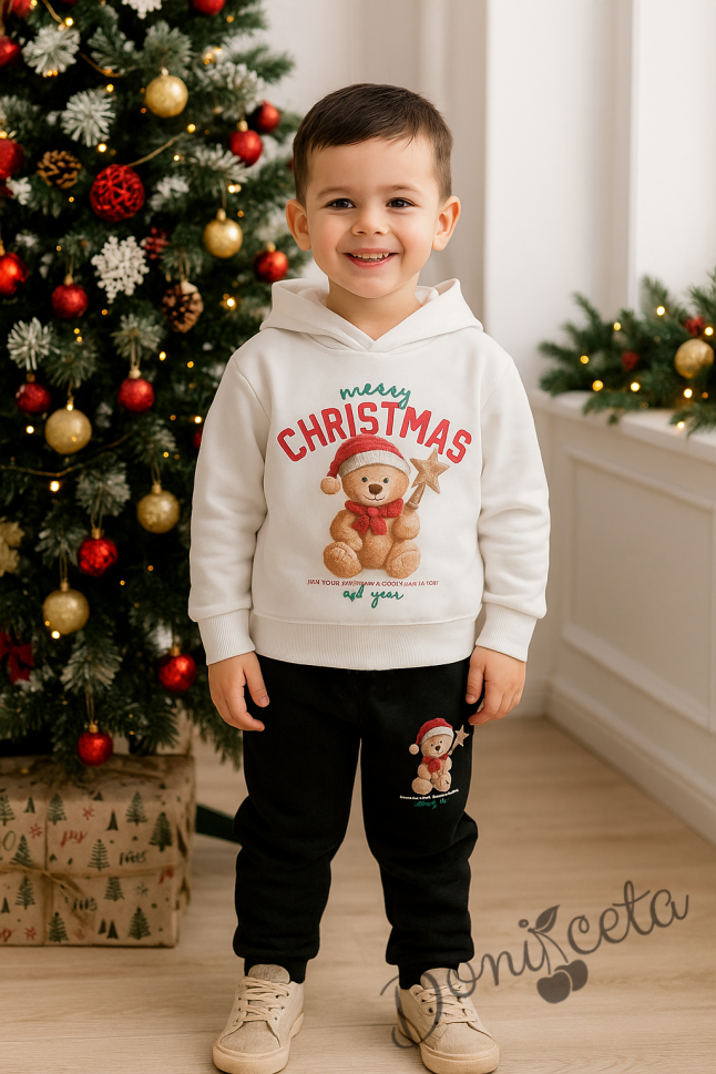 Коледен комплект за момче от блуза с качулка в бяло с мече и надпис и долнище в черно с мече