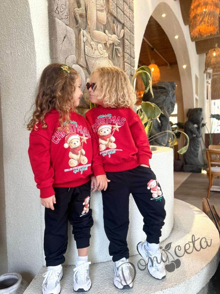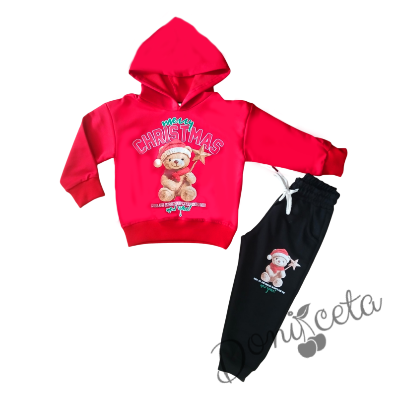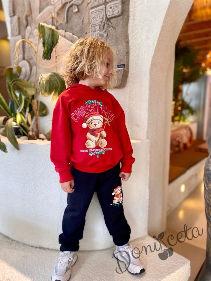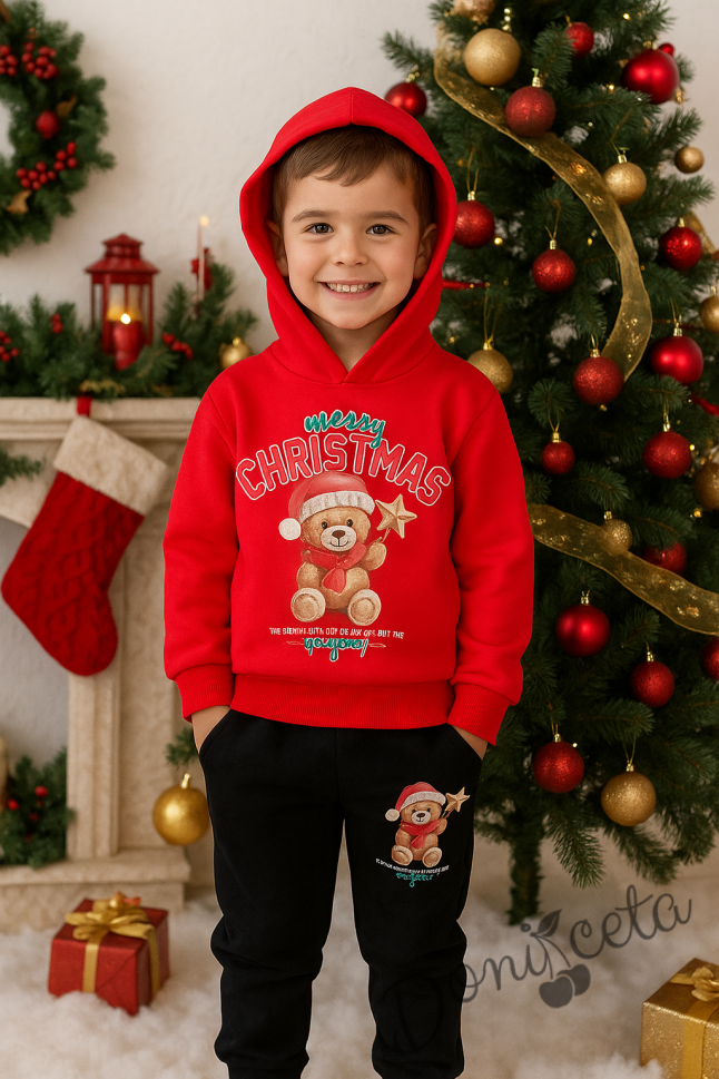 Коледен комплект за момче от блуза с качулка в червено с мече и надпис и долнище в черно с мече