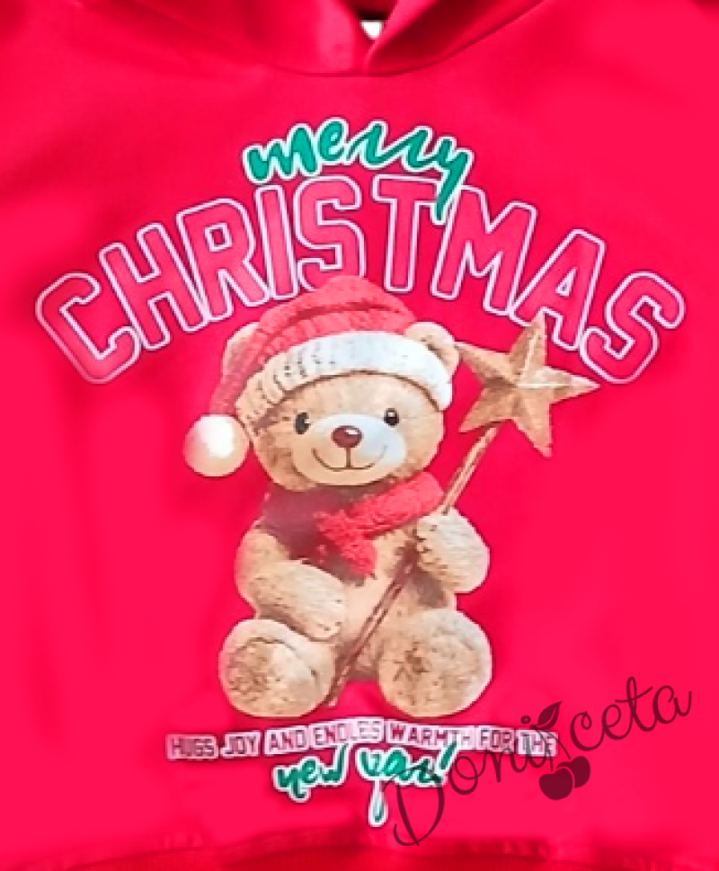 - блуза в червено с качулка и сладко мече с коледен надпис