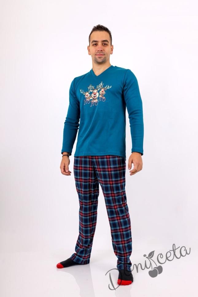 - Прекрасна памучна коледна пижамка в синьо с еленчета и надпис.
