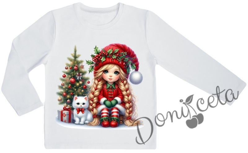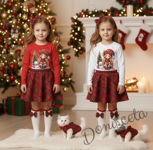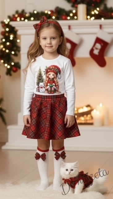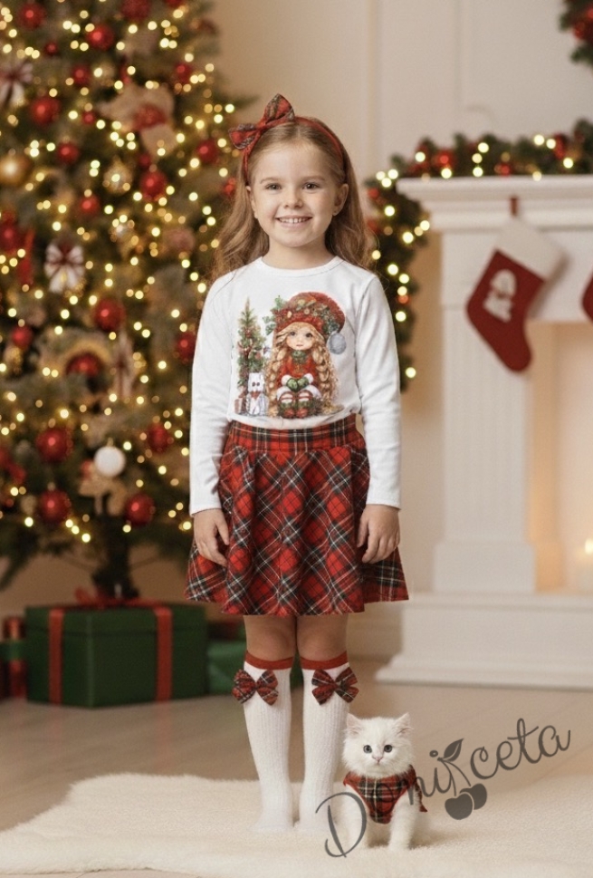 Комплект за момиче от 2 части-пола клош от трико Роси в каре и блуза с дълъг ръкав в бяло с коледна картинка Карена