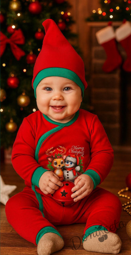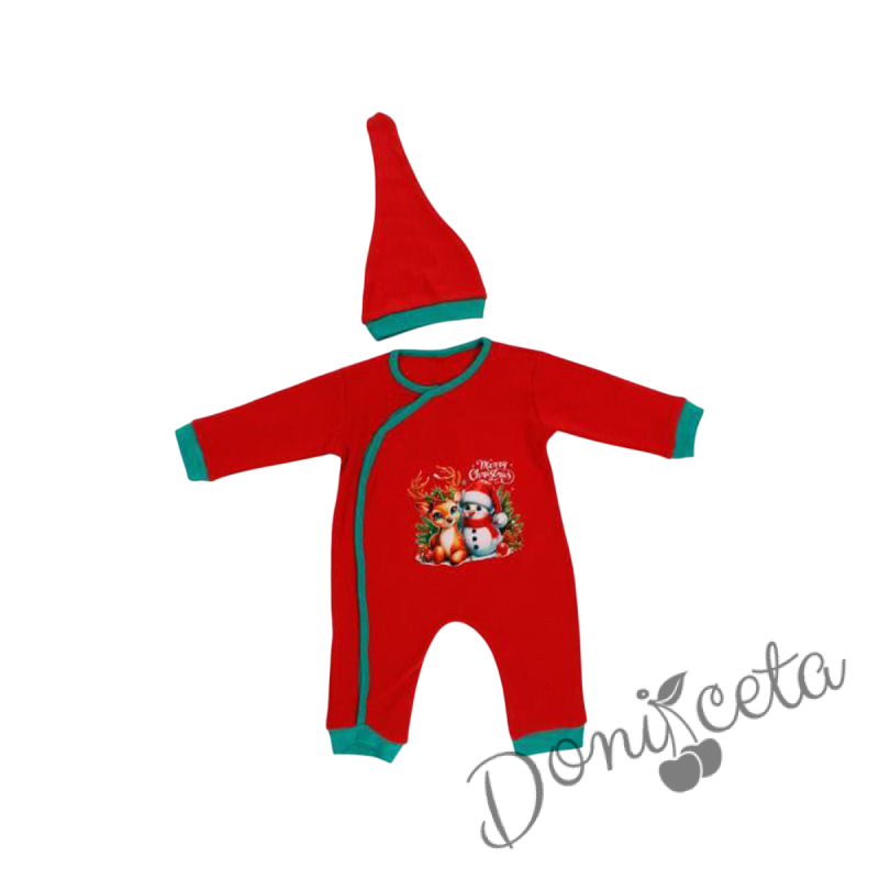 Бебешки коледен гащеризон в червено с коледна картинка със снежен човек и елен и коледна шапка в зелено