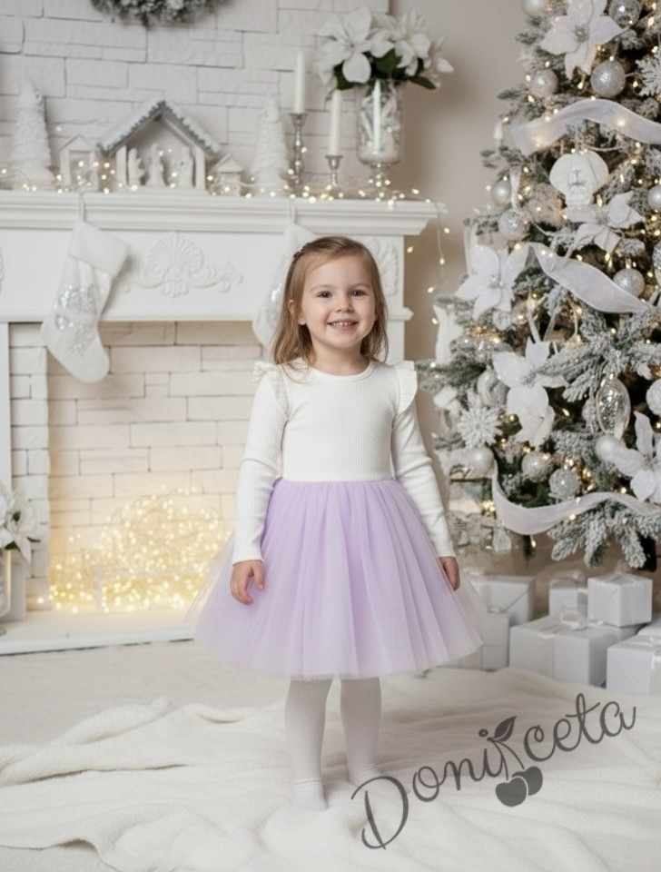 Представяме ви нашата очарователна детска рокля с дълъг ръкав, перфектна комбинация от комфорт и елегантност. Тази красива рокля е в нежен цвят екрю, комбиниран с ефирен лилав тюл, което я прави идеална за всяко специално събитие или просто за една красива разходка.