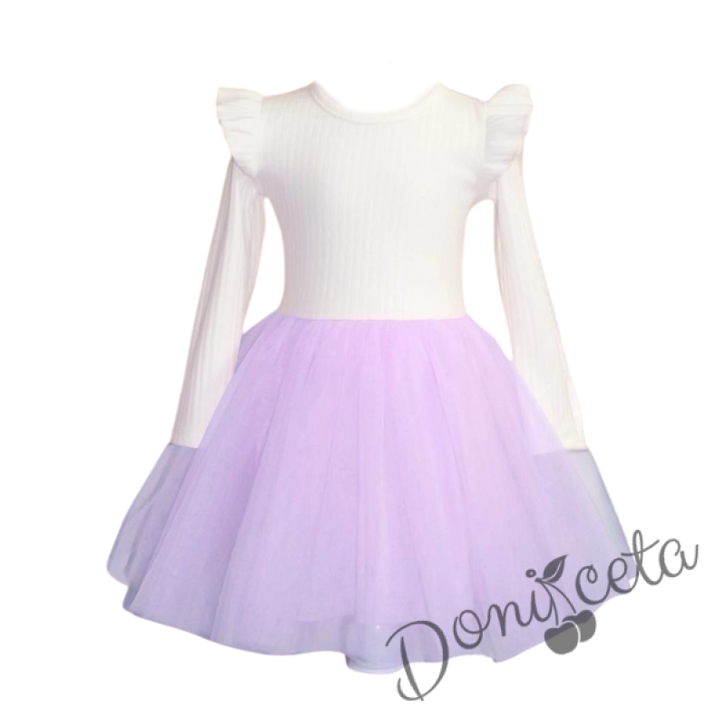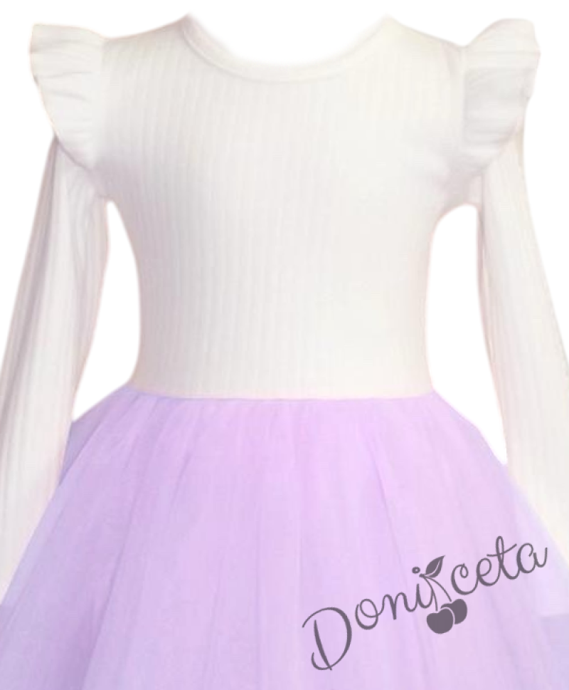 Детска ежедневна рокля с дълъг ръкав в бяло и лилаво с къдрички на рамената Оливия от колекция Лилавина