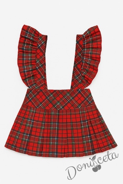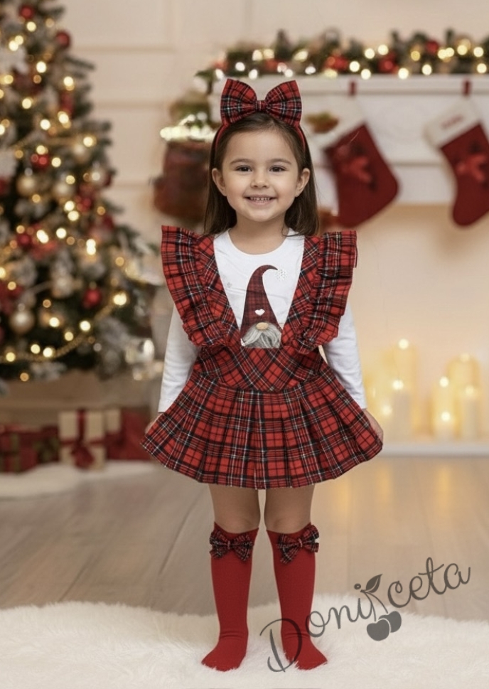Комплект за момиче от блуза в бяло с коледна картинка на джудже и сукман в каре Карена