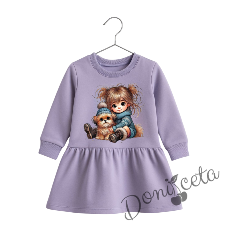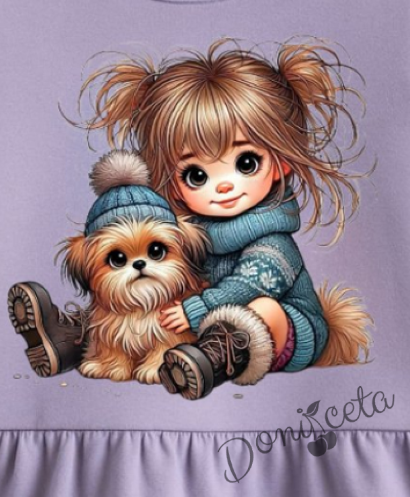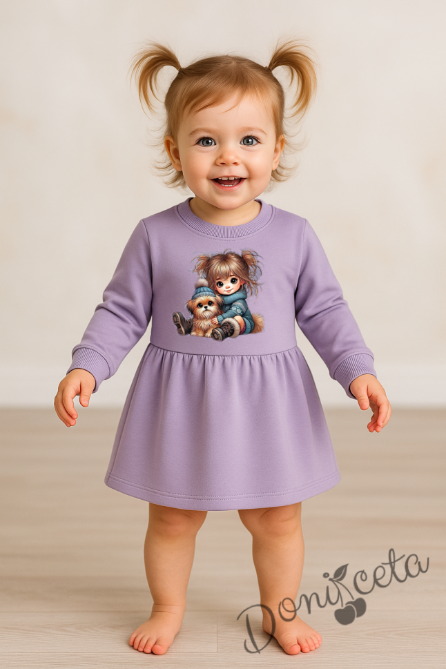 - Много сладка детска рокля за момиченце в лилаво с картинка на момиче и куче.