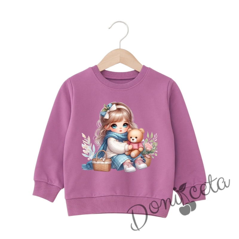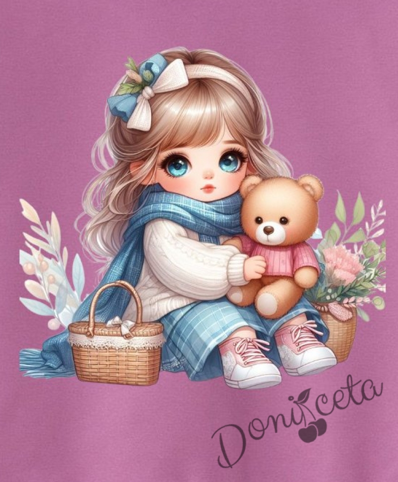 Детска/бебешка блуза в лилаво с дълъг ръкав за момиче с картинка на момиченце и мече
