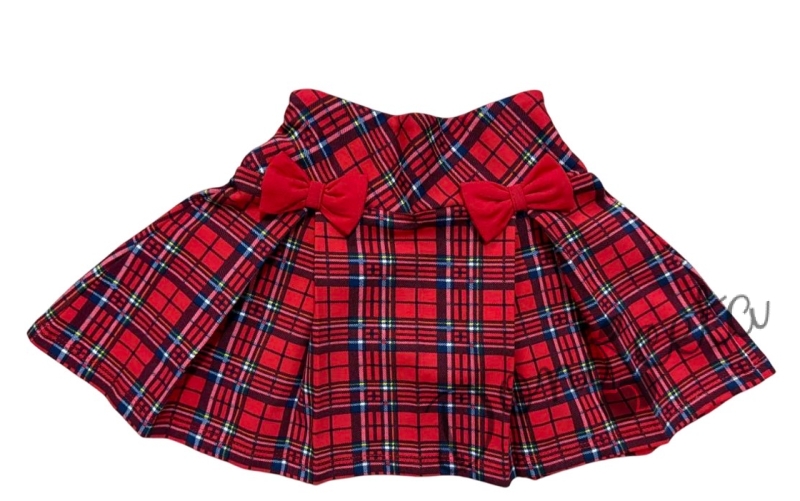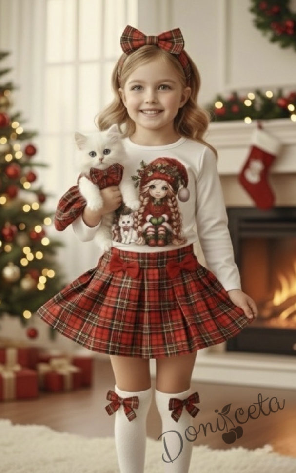 - Прекрасен комплект за момичета от пола плисе в червено каре и блуза в бяло с дълъг ръкав с апликация момиче с каре и коледни мотиви.