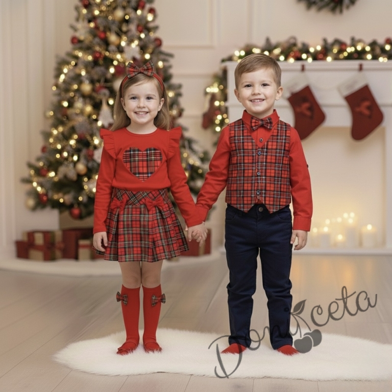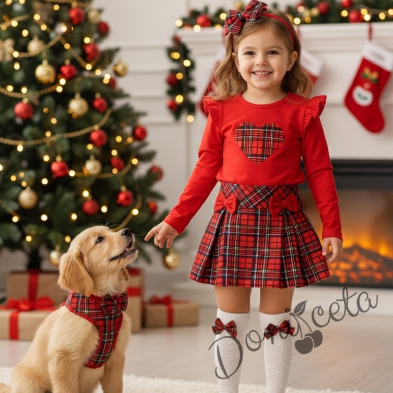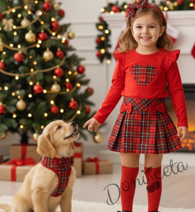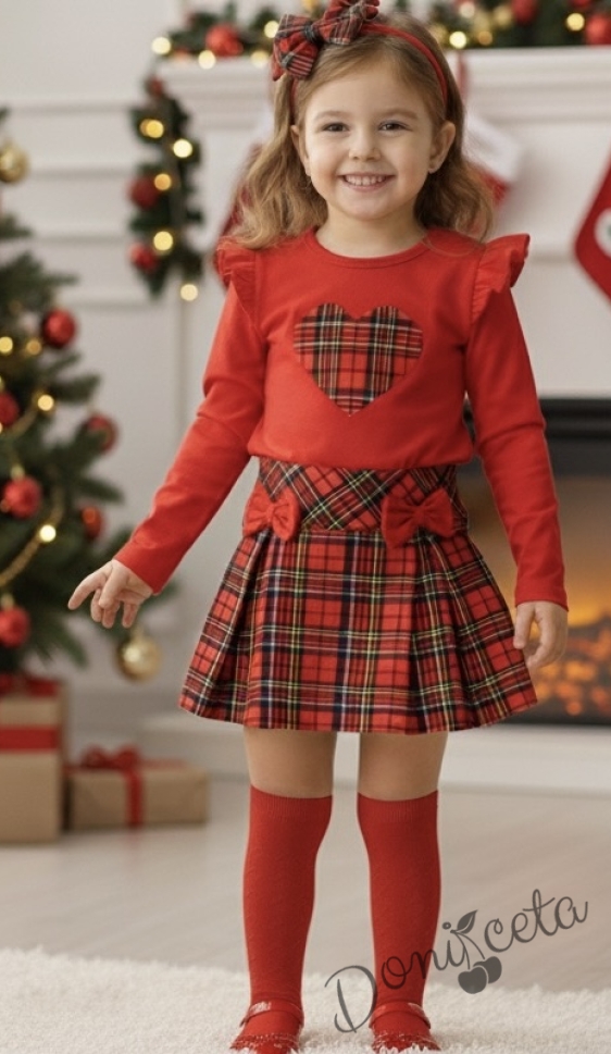 Комплект за момиче от 2 части-пола Вили от трико в каре и блуза с дълъг ръкав в червено със сърце в каре Карена