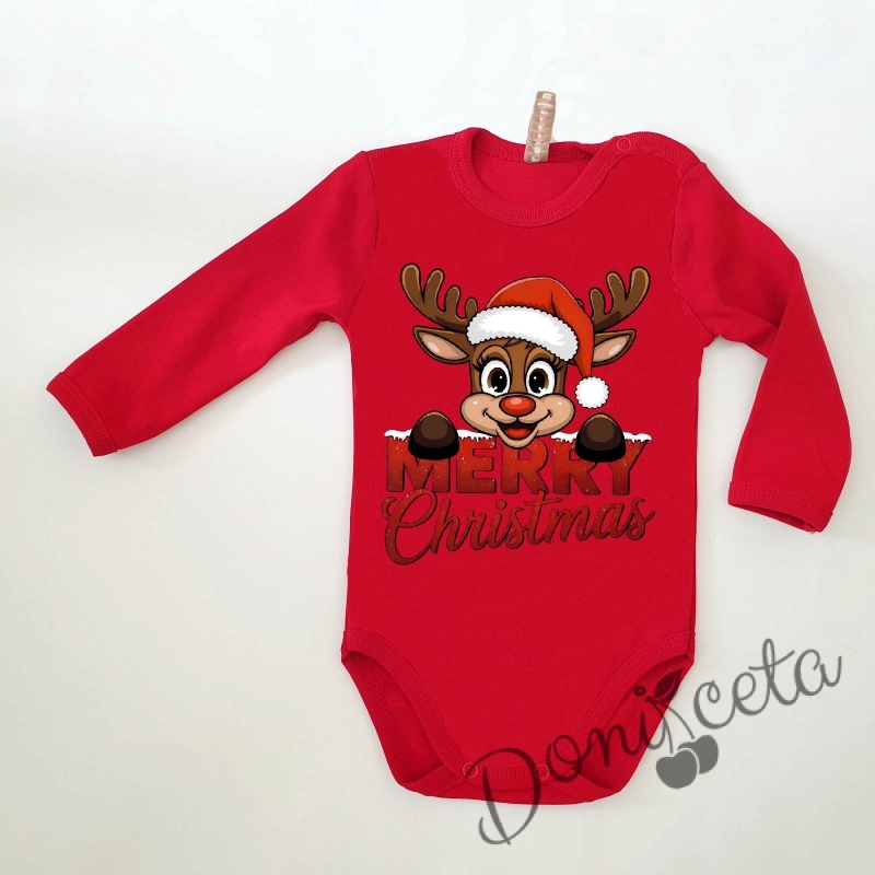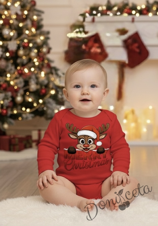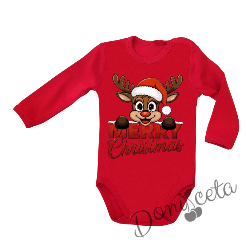 Коледно бебешко боди с дълъг ръкав в червено с еленче