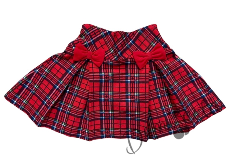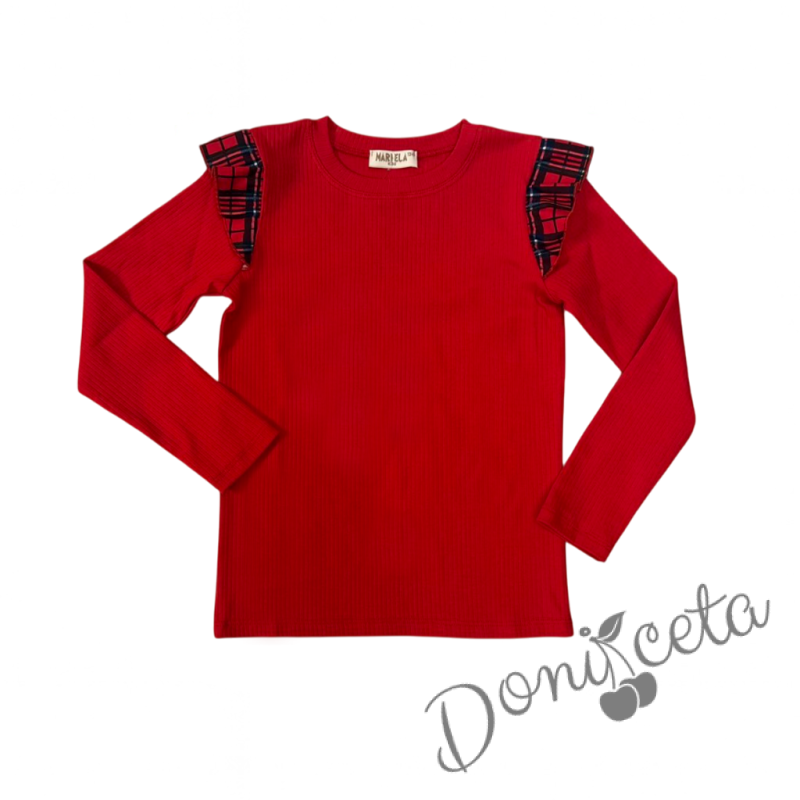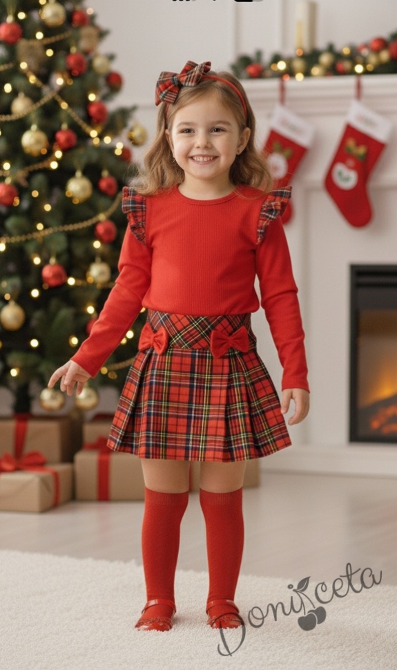 Комплект от 2 части за момиче-пола Вили от трико в каре и блуза с дълъг ръкав в червено с къдрички в каре Карена