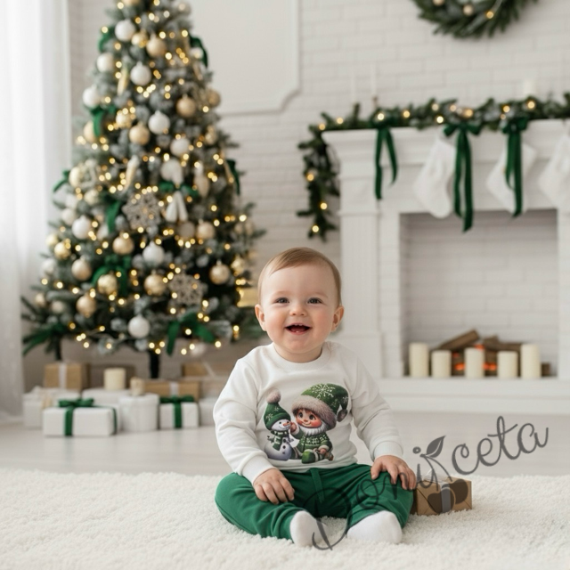 Бебешки коледен комплект от блузка в бяло с коледна картинка и панталонки в зелено
