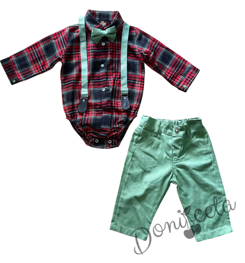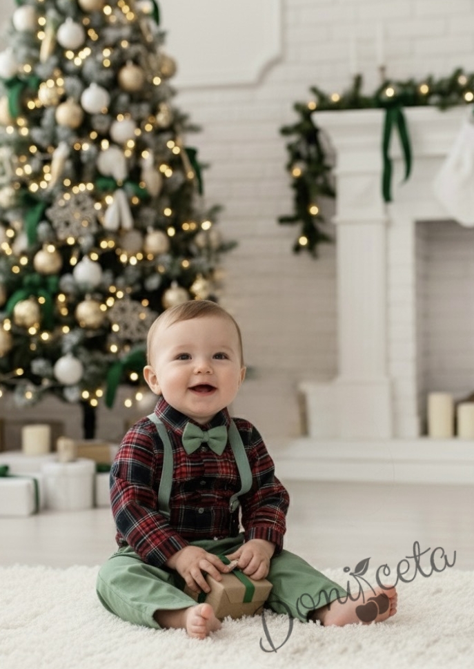 Коледен бебешки комплект от риза каре, панталони в зелено с тиранти и папийонка в зелено