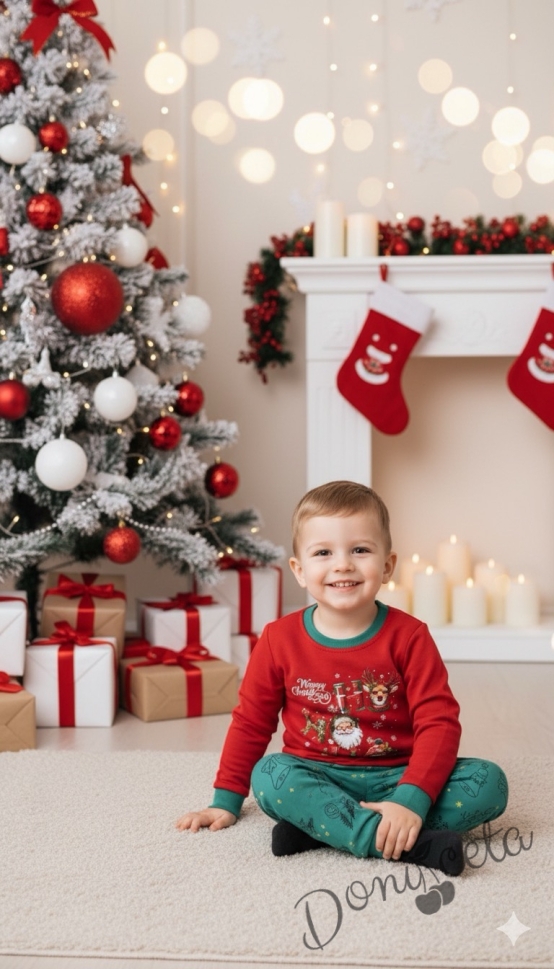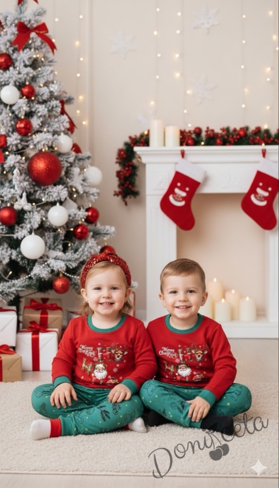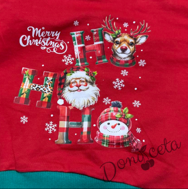 Коледен бебешки/детски комплект от блуза в червено и панталонки в зелено с коледни мотиви