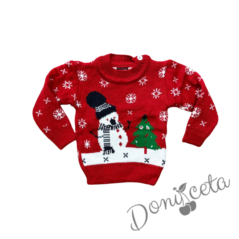 Представяме Ви прекрасен коледен пуловер в червено със снежен човек и елха!