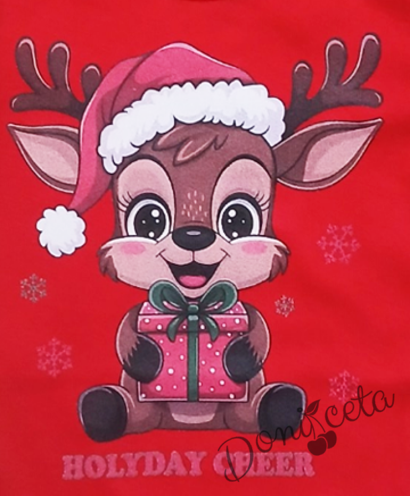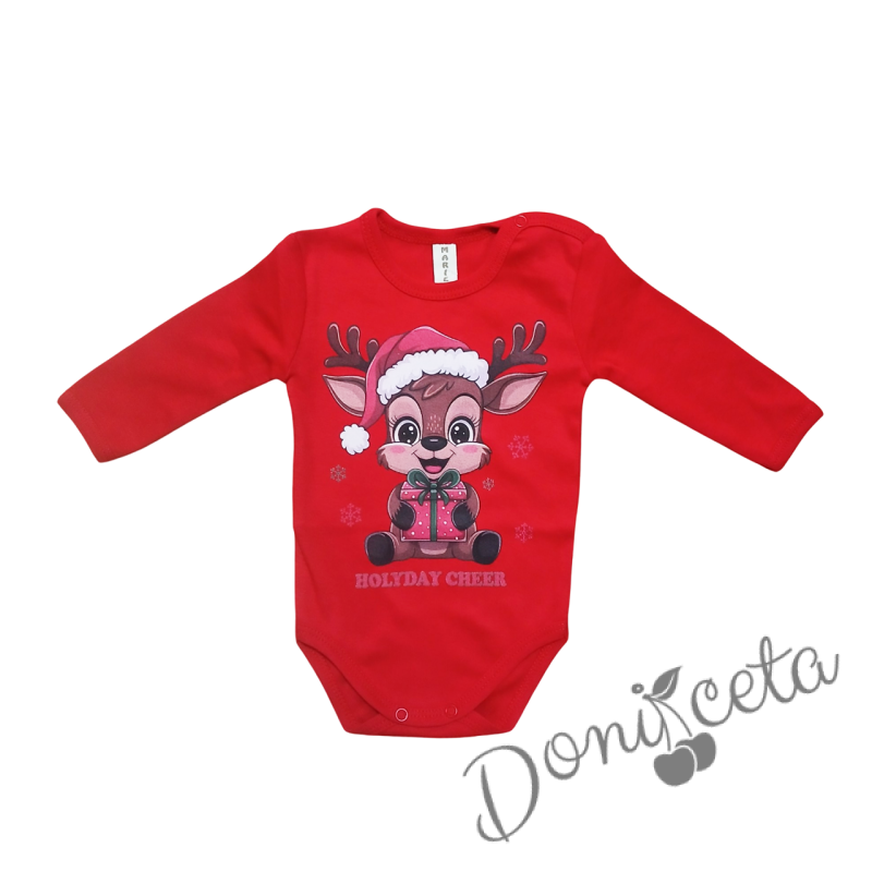 Коледно бебешко боди с дълъг ръкав в червено с еленче за момиче