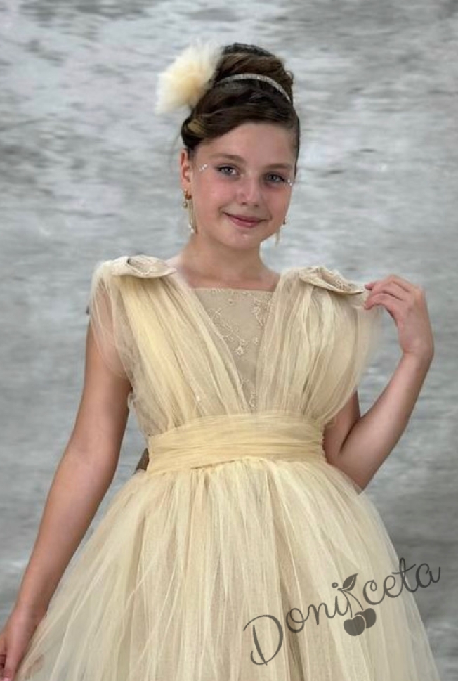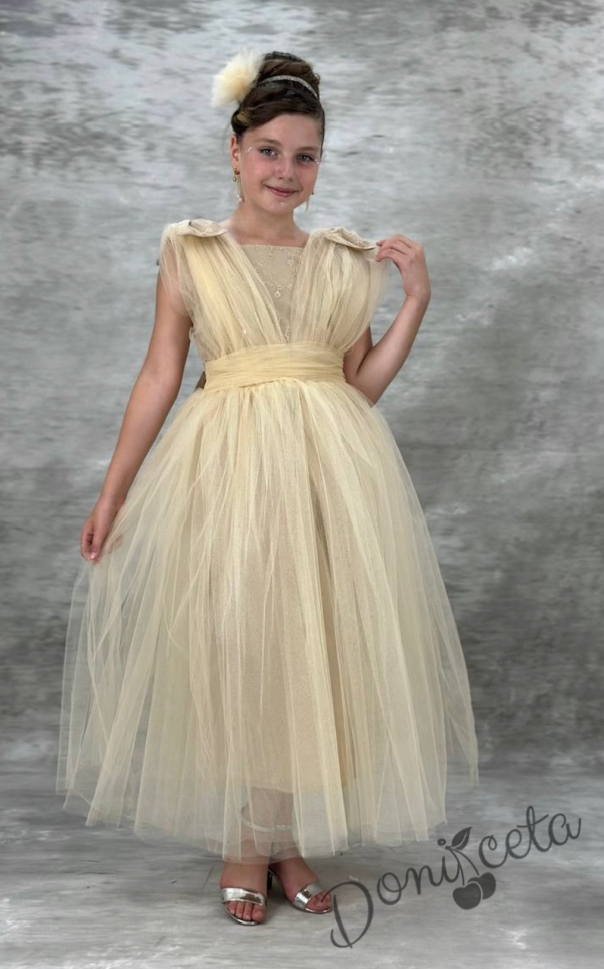 • Много оригинална официална дълга детска рокля в златисто с тюл до долу.