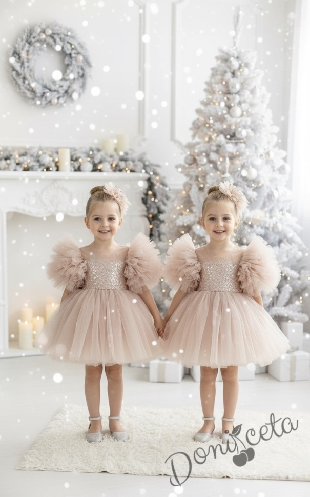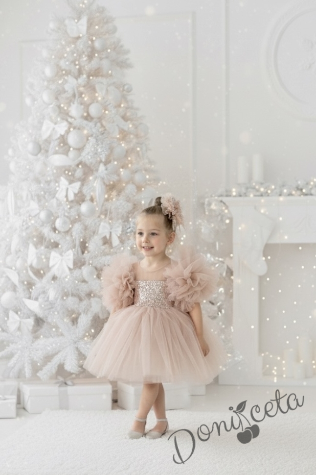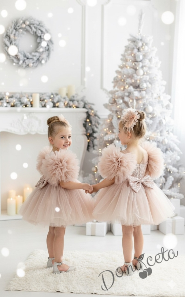 Детска официална рокля Блян с тюл в пепелно прасковено, помпони и панделка за коса