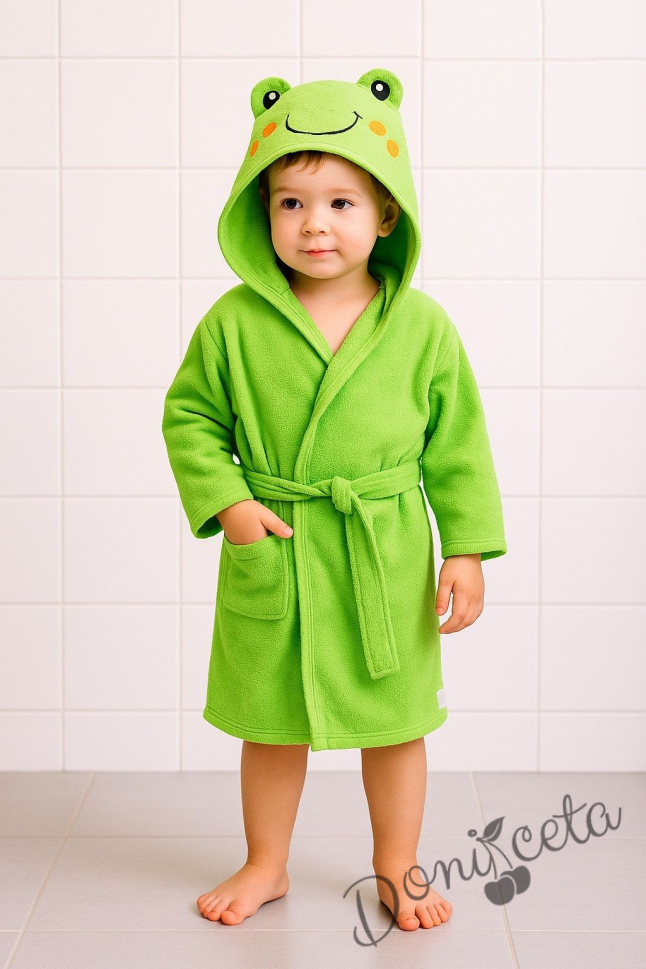 Детски халат за баня с качулка с жабче и джобчета в зелено