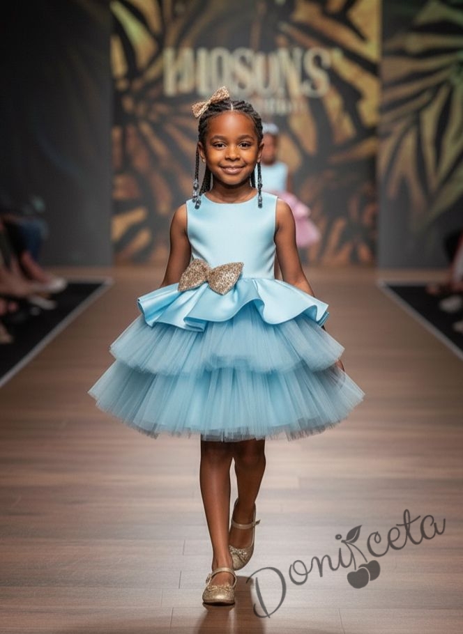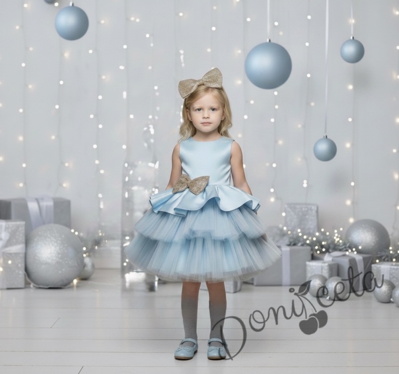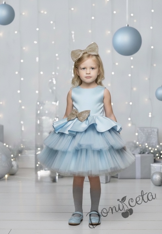 Коледна детска рокля в светлосиньо с тюл и панделка в златисто