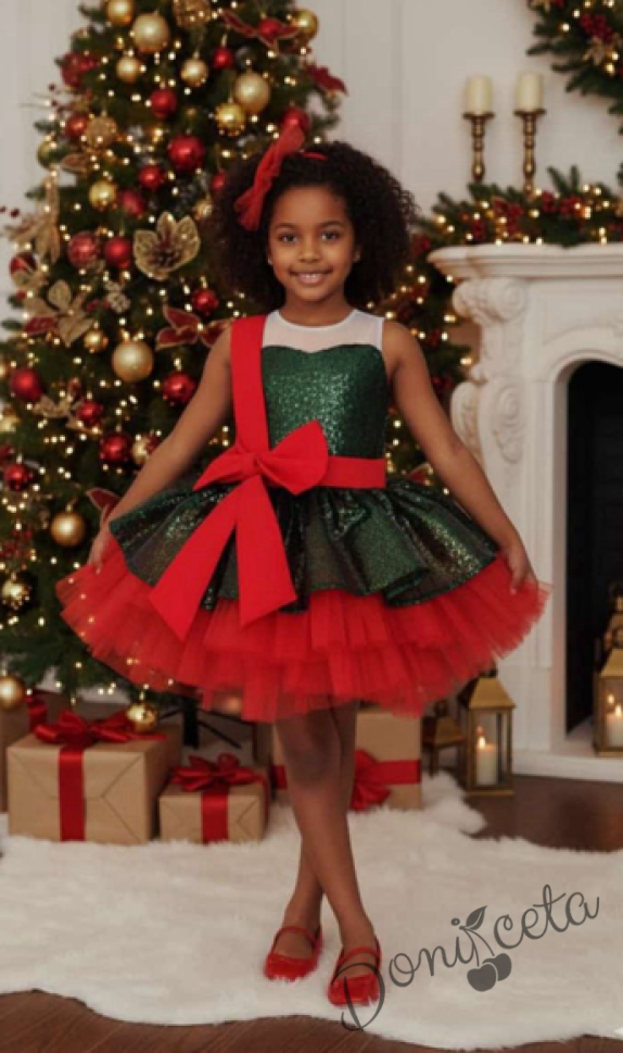 Коледна детска рокля с пайети в зелено с голяма панделка и тюл в червено с фиба за коса Венета