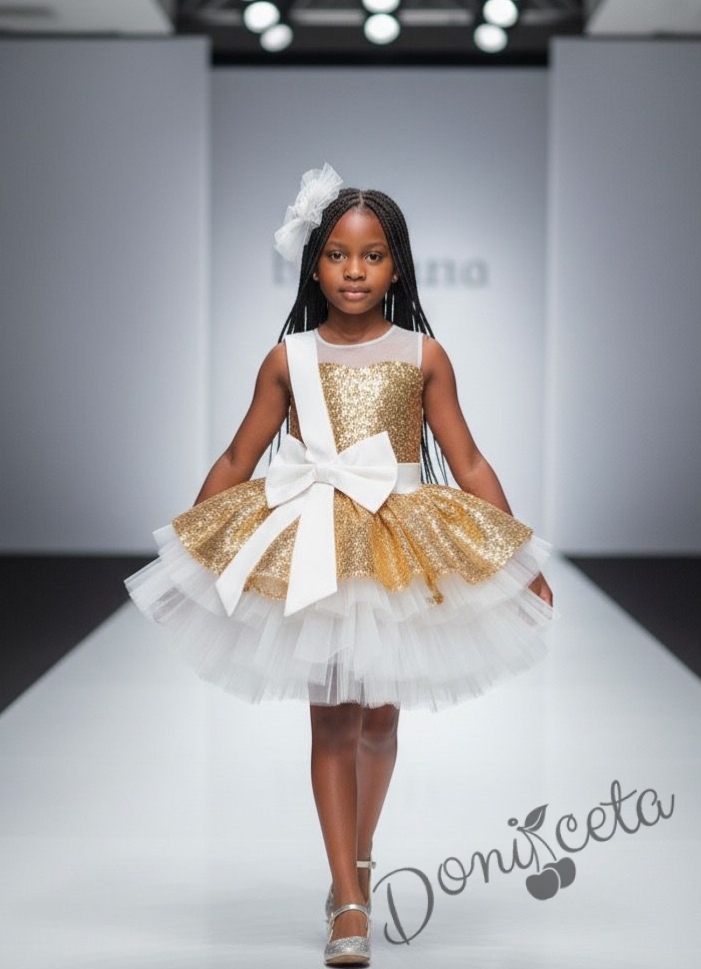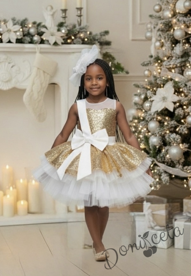 Коледна детска рокля с пайети в златисто с голяма панделка и тюл в бяло и фиба за коса