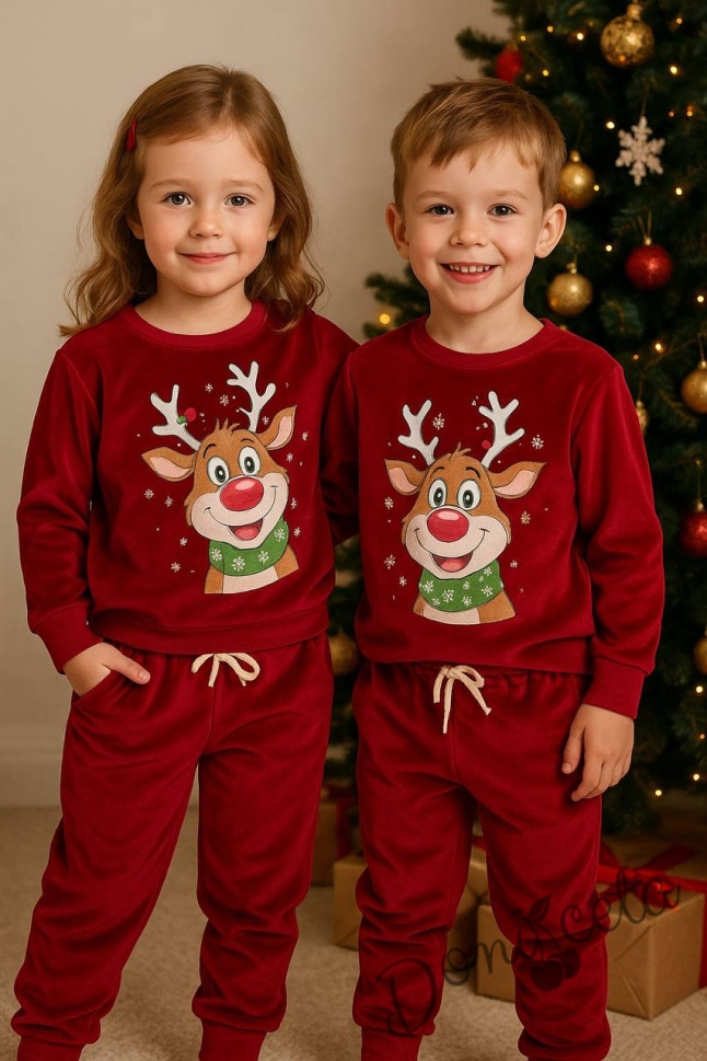 Детски коледен комплект за момиче/момче от плюшена блуза с коледен елен и плюшени панталонки в червено