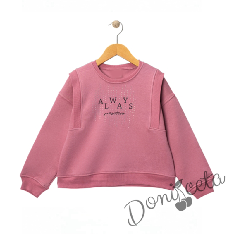 Детска блуза в пепел от рози с дълъг ръкав за момиче с надпис и блестящи камъчета