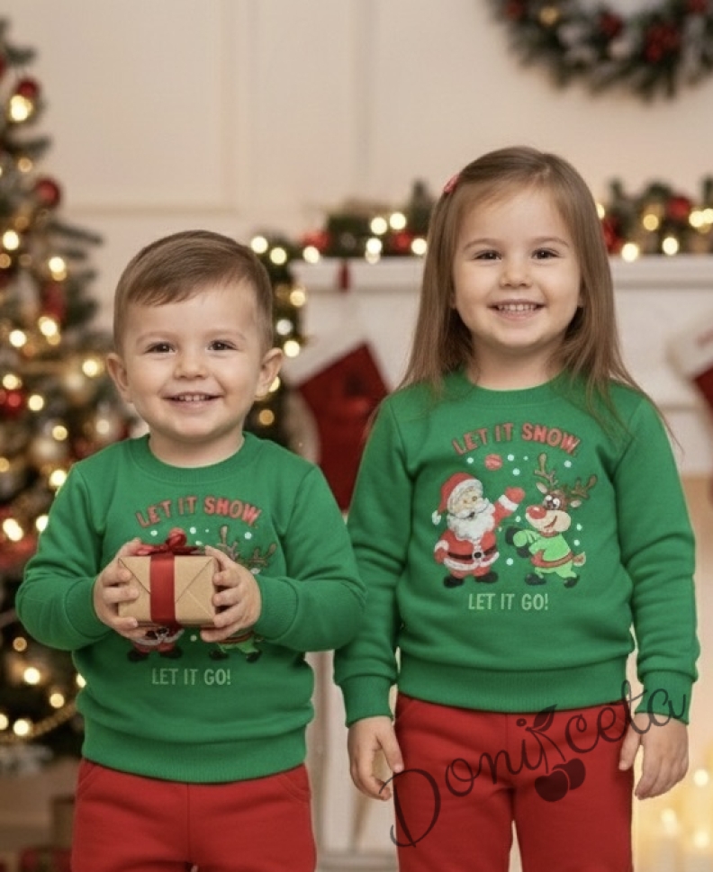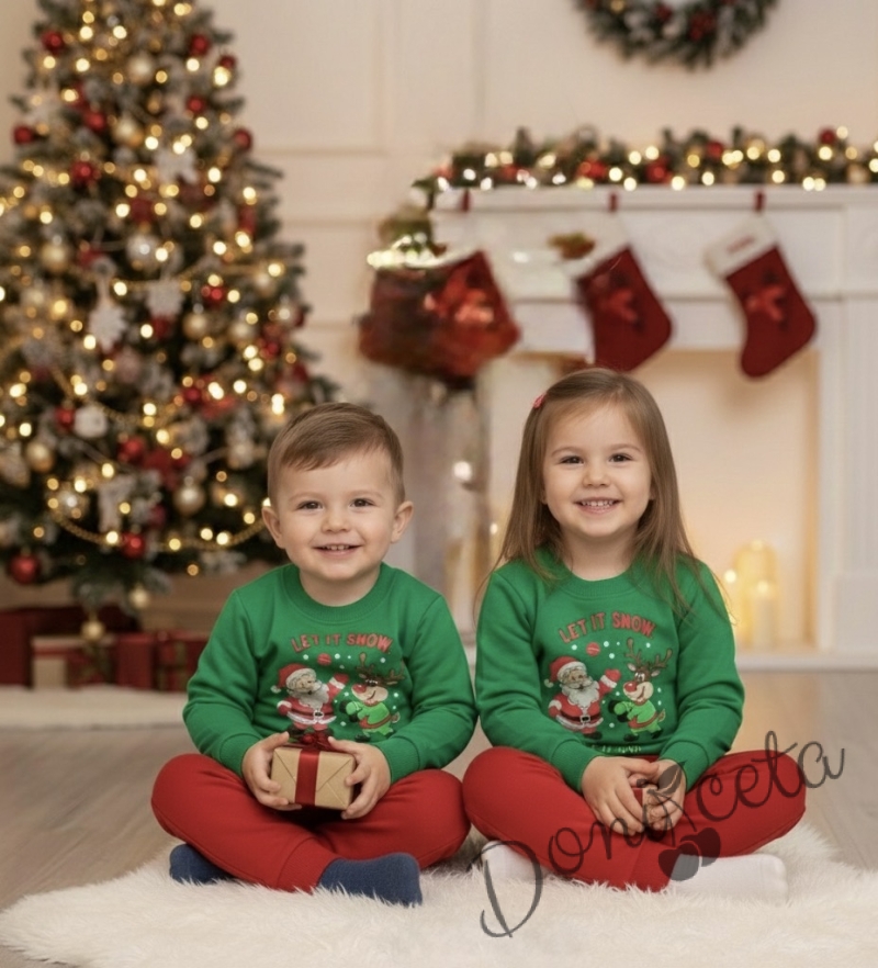 Ватиран коледен детски комплект от блуза и панталон в зелено с плюшени акценти