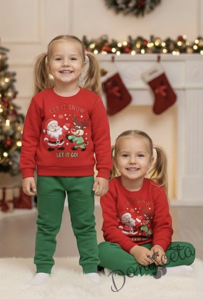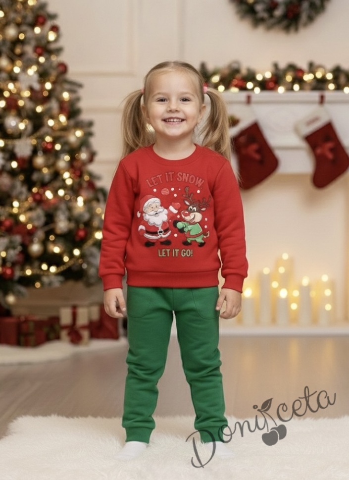 - Топъл и удобен весел бебешки/детски комплект от блузка в червено с коледни мотиви и панталонки в зелено.