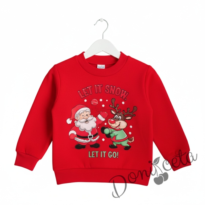 Детски коледен суитшърт в червено със снежен човек и Дядо Коледа
